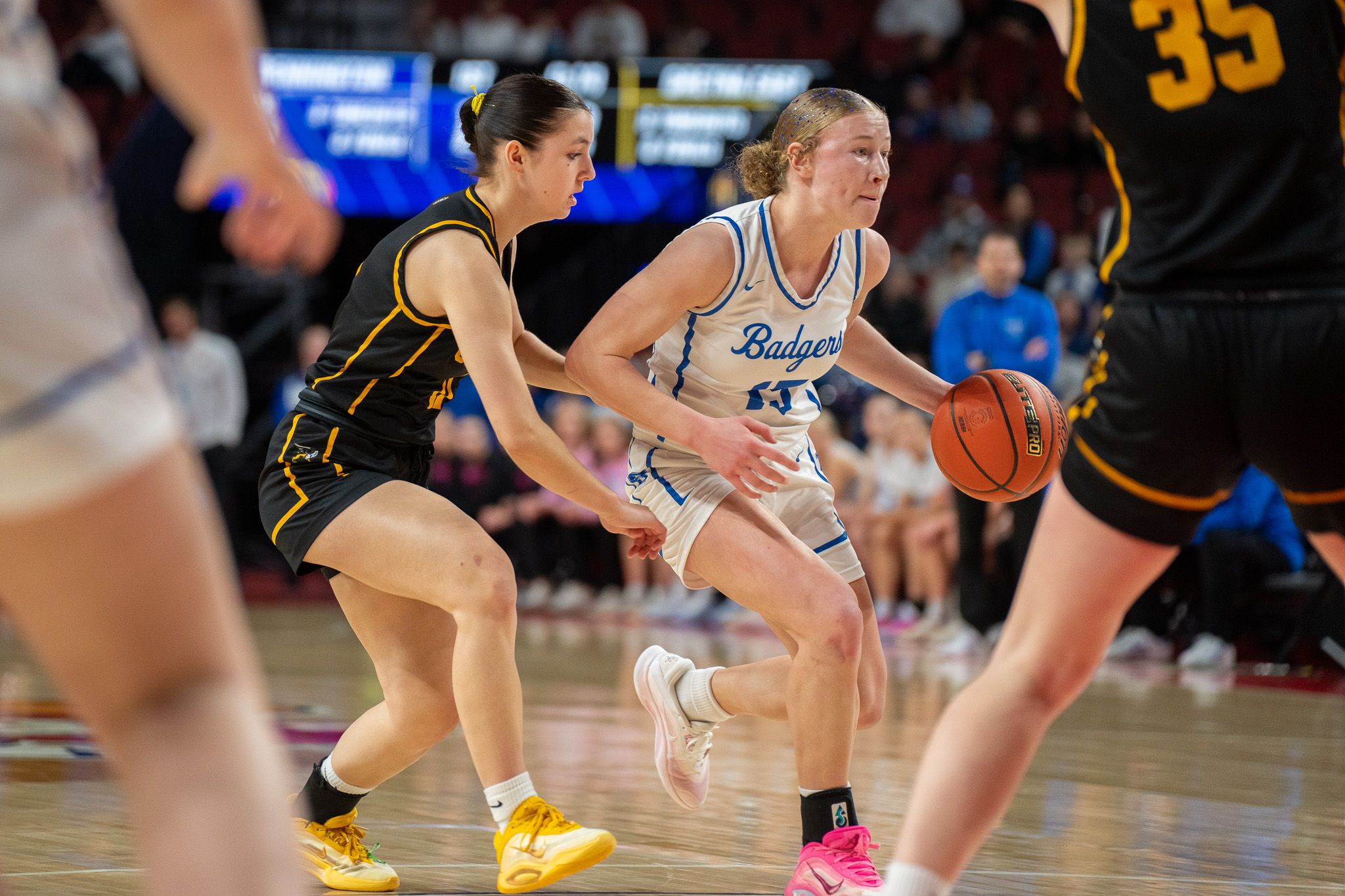Bennington’s Macie Reiner handles the ball in the Badgers state championship game win over Gretna East. (Harvest Sports / Andrew Placke)