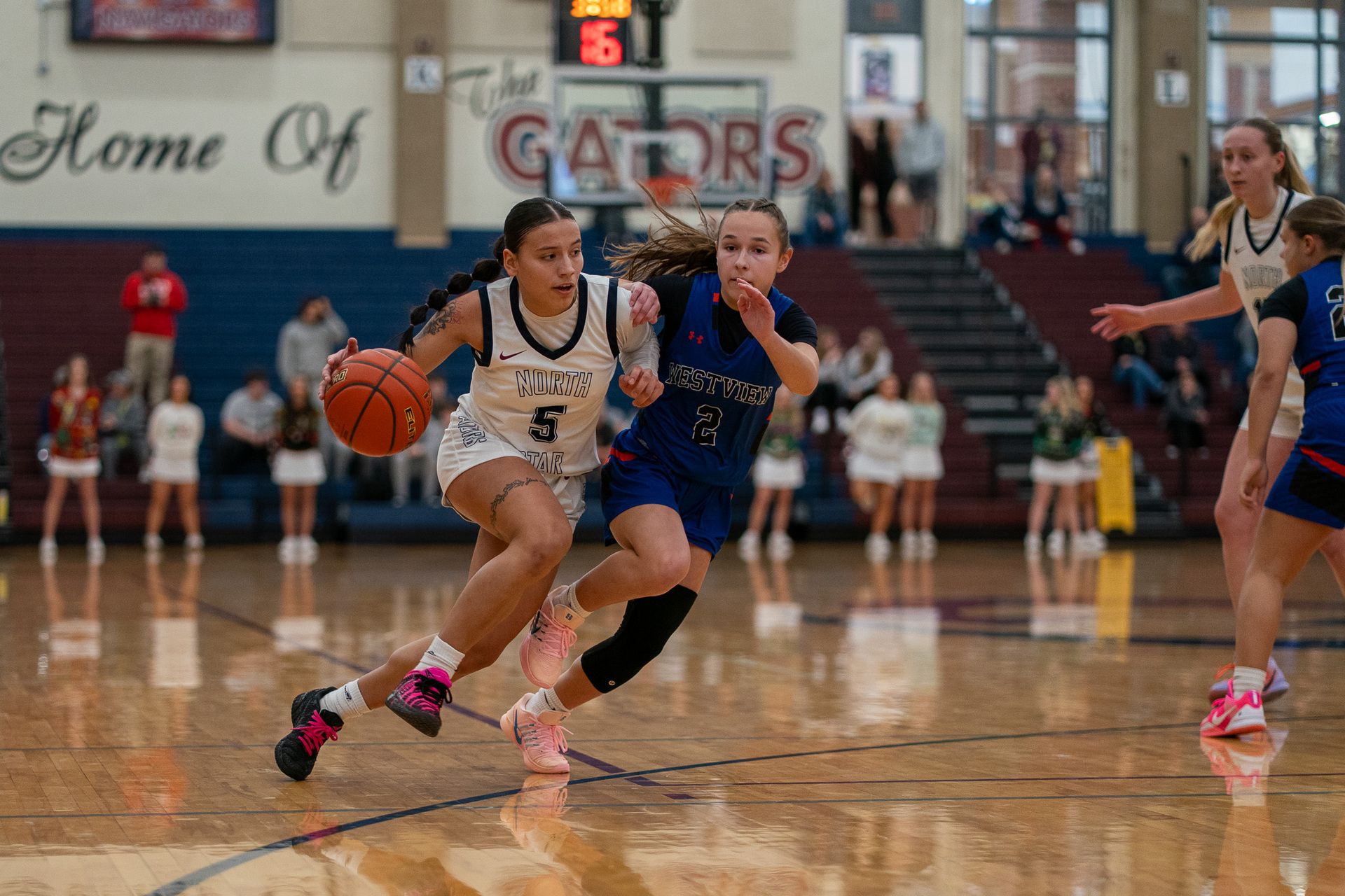 Lincoln North Star’s Joyce Johnson (5) drives the ball past Omaha Westview’s Lucy Fierro in the Gators 32-16 win December 22nd. Both teams are in this weeks Power 20. (Harvest Sports / Andrew Placke)