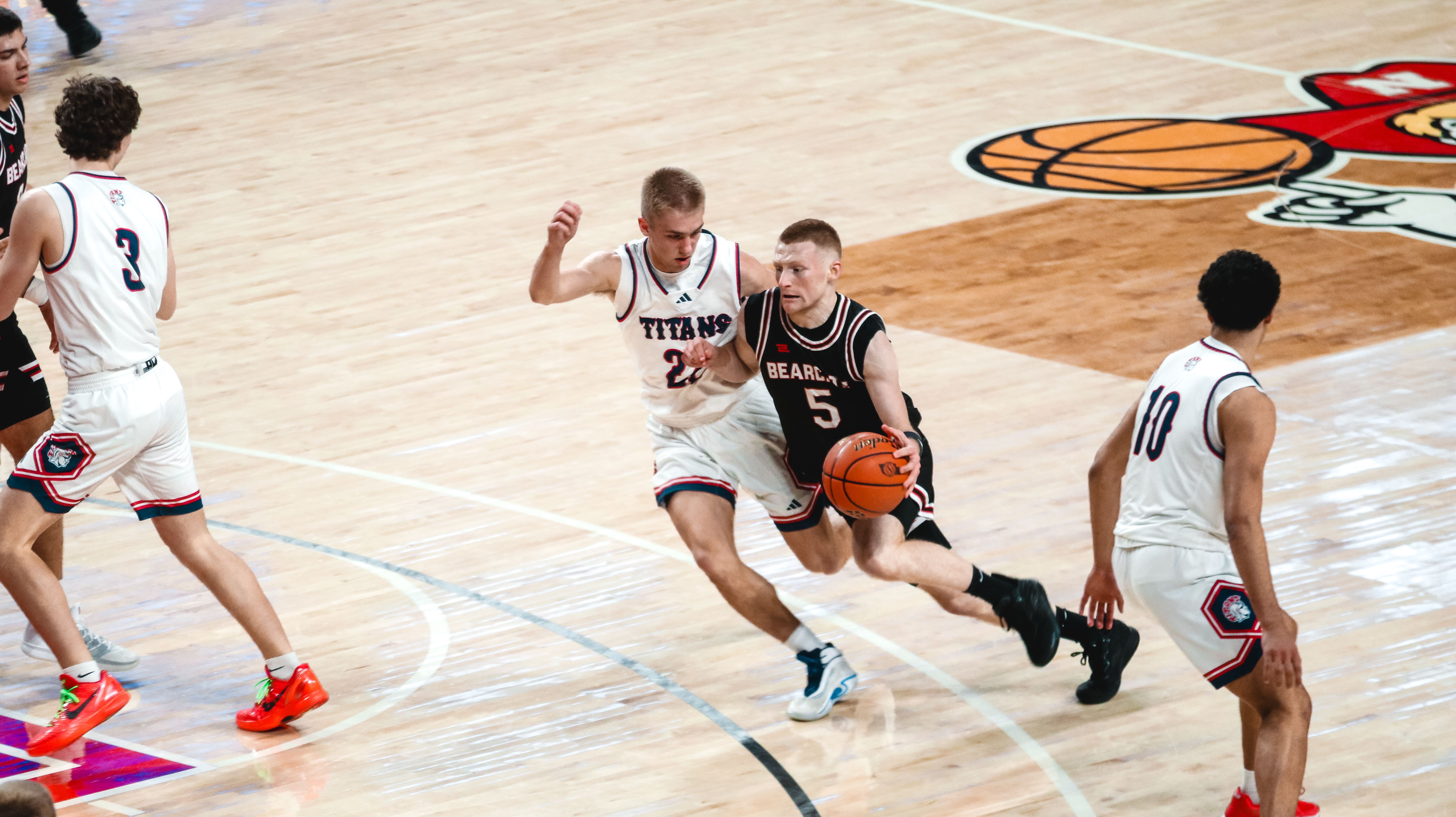 Do everything. Scottsbluff’s Nate Kelley brings the ball up the floor in the Class B state semifinals against Norris. Kelley scored 27 points in the Bearcats 64-60 win. (Harvest Sports / Dante Boelhower)