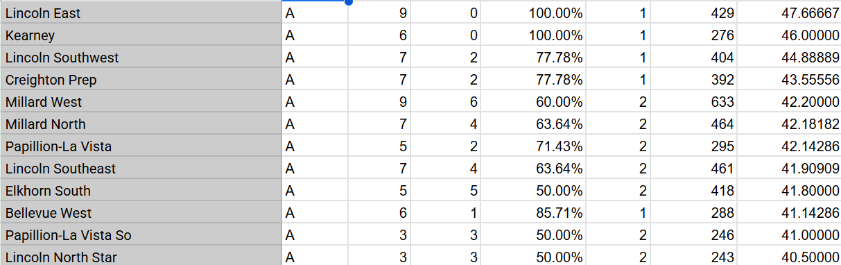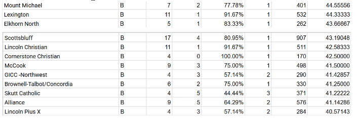 Class A defending champion Lincoln East is still at the top of the class while Kearney is also undefeated. In Class B defending champion Elkhorn Mt. Michael has passed Lexington and Elkhorn North for the top spot.